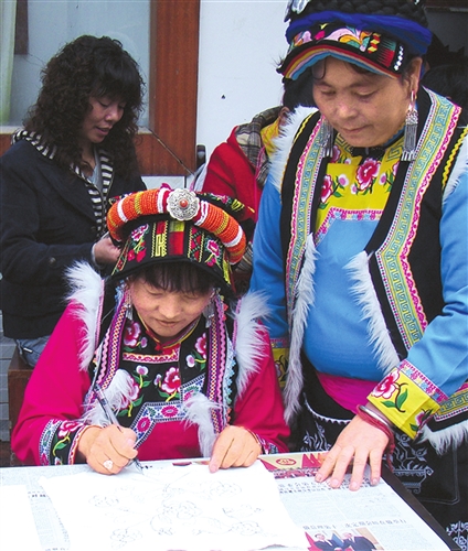 本报讯(吴志刚 记者 廖兴友摄影报道)“在桃坪村,刺绣工艺已经成为当地产业的一部分,80%的村民都走向了刺绣岗位,月收入都在1200元以上。”昨天早上,阿坝藏族羌族自治州理县桃坪乡桃坪村委会主任龙秋花来到地震极重灾区什邡市蓥华镇,教蓥华的妇女刺绣、跳锅庄舞。 龙秋花说:“桃坪羌寨和蓥华镇同属地震重灾区,我们能够把民族文化传递到这里,让他们脱贫致富。”“老师,我这个该怎么绣?”昨天下午,50多名妇女在石门村村部围坐在一块,认真地做着手里的针线活,包括龙秋花在内的3名老师正在教着大家如何做羌族刺绣。 老师教得仔细,学生们也学得认真。石门村1组的罗在芝已65岁了,她专门从街上买来各色彩线和绸缎,准备认真学几招。罗在芝说,她以后就能在家门口就业。龙秋花拿着一双精美的小鞋说:“这双小鞋至少能卖5元钱。我们将为其寻找市场或联系订单式合作商,让村民们在家门口就业。” “让石门村村民在家门口实现就业只是桃坪羌寨帮助他们灾后重建的一个桃坪羌寨的刺绣老师现场授艺方面。”龙秋花说,她们还将在课余时间教村里年轻女娃娃跳“锅庄”,以此来丰富她们的精神生活。在今后旅游发展中,让羌族舞蹈能成为石门村旅游当中的一个重要组成部分。 开农家乐的村民罗先生说:“羌族的‘锅庄’很有特色,我以后用‘锅庄’来吸引游客,再挂上现在学的刺绣工艺品,做一个羌族文化特色的农家乐。” |