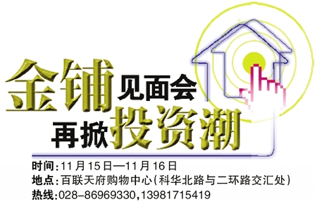 本周末(15-16日),由本报主办的“2008华西金铺投资见面会”将在成都百联天府购物中心火热举行。在为期两天的活动中,成都60多个商业地产项目将集中展示,来自省内外的众多投资者将携10亿热钱到现场选铺。