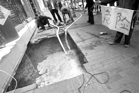“我们这里地面有点不对劲,踩上去软绵绵的!”昨天中午,成都双林北支路45号门口人行道上,原本平整的路面突然沉陷,一房产中介商铺和茶铺门口出现一个约2米宽、3.6米长、深约4米的大坑,里面不断涌出污水,随着塌陷范围越来越大,商铺门口小块地面逐渐悬空,商家紧急撤离。 店门口塌陷深坑往外直冒水 昨天中午12点,新鸿路街道新华社区工作人员接到市民电话,反映双林北支路45号门口地面沉下去一小块,还有水从地下冒出。社区工作人员赶到现场约两分钟后,地面又出现大面积塌陷,一下冒出个长约1米、宽50厘米的坑,里面积有大量污水,水面距离地面约有一米高,而地面的砖块、泥土则掉进坑里不见影踪。“看样子坑还不浅。”社区工作人员王先生立即在坑的周围拉起了警戒线,阻止行人通过。同时,他又让商铺店员将放在门口的冰柜、桌子等重物移开,随后铺子里的人紧贴着墙边,从还没塌陷的地方转移到了安全地带,期间还不断有泥土往坑里掉。见坑仍在扩大,社区赶紧给成都市排水设施管理处打了电话。 地下渗污水泡软泥土引塌陷 中午12点过,成都市排水设施管理处成北管理所工作人员赶到现场,架起两台水泵,开始抢修。由于污水不断渗出,坑内积水已经有四五米深,工作人员决定将水抽干后进一步排查原因。下午3:30,水坑散发出阵阵恶臭,水泵正将污水排到马路边的阴沟中,期间还不断有泥土和砖块掉进坑内。半个小时后,离泥坑约1米远的地面,又现出另一道裂痕,地面随着裂痕又有新的塌陷。 据成北管理所巡视组江组长介绍,昨天上午10点,他们的高压射水车在疏通马路上的窨井时,水管探测到井下有泥沙,当时他们就怀疑某个地方可能出现坍塌。随后就接到这边路面渗水、坍塌的电话。 江组长说,他们初步判断路面塌陷是由地下污水渗出,泥土经浸泡变软引起的。因污水管道上方修了商铺,没法疏导,才导致了堵塞和渗水。记者看到,两家商铺之间的一根红色承重柱子正好压在窨井盖上方,商铺也没有地基,“这些商铺已经影响市政设施了。” 社区工作人员王先生表示,污水井盖上原本是人行道,上世纪90年代新华公园修建以后,这里就起一排商铺。据居民们反映,这排商铺下至少压着三个污水井。 “如果塌陷范围继续扩大,我们也不敢再抢修。”江说,坑内积水完全排干还要好几个小时,要是地面不断塌陷,威胁房屋安全,他们只能选择通过其他管道排水,或者通过相关部门协调,拆除沿街商铺。 记者江英摄影谭曦 |