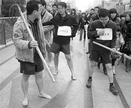 昨天中午,市区室外温度仅10℃左右,一群网友穿着篮球短裤、赤脚出现在春熙路,上身则裹着棉袄、羽绒服,他们的衣服上贴着印有“汽车大王”、“贸易大亨”等职业名称的白纸、扛着已生锈的锄头和钉耙,在总府路天桥来回走动(下图),“整啥子名堂?不冷啊?”虽然觉得莫名其妙,但逛街的市民们纷纷拿出手机、相机来拍照。 此次“行为艺术”的组织者佟鑫解释说,考虑到金融危机的影响,汽车、金融、进出口贸易等行业受到的打击相对较大,“我们每个人代表了这些行业,短裤光脚比喻正在经历一场严冬和困境。”佟鑫说,扛着的榔头、钉耙、锄头等代表着劳动工具,而特意将春熙路作为背景,则是为了对比说明,金融危机虽然有一定影响,但成都仍然繁荣,市民消费热情依然很高,我们一定可以抵御金融“寒冬”。 记者江英摄影刘陈平 |