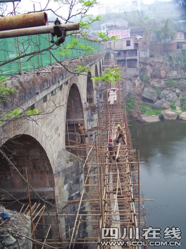 5月31日前货车和19座以上大客车须绕行 本报讯(记者杨元禄)昨日上午10时许,从威远连界镇发往资阳的川K23167大客车,满载乘客途经321国道资中县球溪河大桥桥头时,被交警、路政人员拦下:“球溪河大桥存在严重交通安全隐患,5月31日前,19座以上大客车严禁从桥上通行,请从渔溪绕道成渝高速。” 321国道,系抗战时期百万民工抢修出的抗战物资大动脉。桥墩、桥拱全部用条石建成的球溪河大桥,历经数十年风雨,已病害缠身不堪重负。 现场观察可发现,支撑球溪河大桥的8个石拱桥墩,已出现多条裂缝;大桥两侧用大青石砌成的护桥石,因严重风化已大块大块掉落,且与桥墩之间出现宽窄不一的错位;大桥两边,用条石砌成的护桥栏已拆除;原本并不宽的大桥桥面,因加固施工,只剩中间一条2米多宽的通道,勉强可供小型客车和行人通行。 “病”得不轻的球溪河大桥, 已成为321国道通行瓶颈。 根据321国道改建方案,球溪河大桥需加宽两个人行道。3月18日下午,施工人员正在桥下搭钢架,两辆载重50吨以上的重型货车从桥上通过时,产生 的共振将大桥两侧的护桥石从30多米高的大桥上像雨点般砸向河面。“当时我们都以为大桥垮了,吓得大家四散逃命。” 球溪河大桥突发险情,立即引起有关方面高度重视。当晚,省、市、县有关部门和桥梁专家齐聚一堂,会诊大桥的“病”情,并作出“未查清情况前,严禁机动车通行”的临时交通管制。 后经专家会诊,得出“大桥主体工程并无大碍”的结论后,3月23日,交警、路政24小时值守球溪河大桥南北桥头,对大桥实行全天候交通管制——即日起至5月31日止,施工单位在对大桥进行加固改造期间,小型客车单边放行,所有货车和19座以上大客车严禁通行。 据现场施工人员介绍,目前,施工单位正加班加点抢进度。“力争在汛期来临前,将大桥两侧的施工架全部搭完,确保5月31日前交付使用。” |