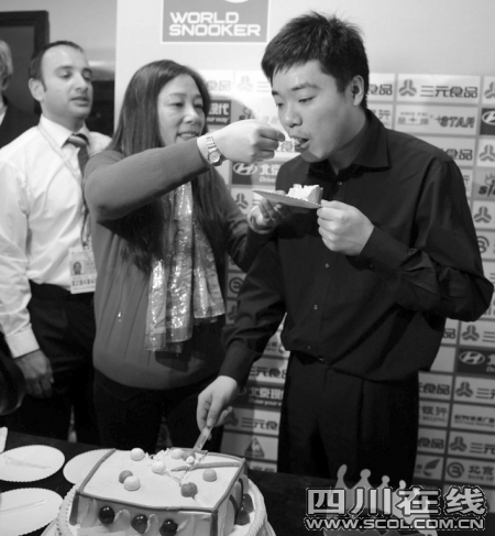 “祝你生日快乐……”前天晚上,在斯诺克中国公开赛新闻发布厅内,全场记者集体唱起了生日歌,与丁俊晖一起庆祝他的23岁生日。丁妈妈送给小晖的蛋糕特意被做成了斯诺克球台形状,看到这个蛋糕,小晖像一个大男孩儿般站在妈妈身边,显得有些不好意思。虽然刚开始被这个突如其来的幸福搞得有些不知所措,但小晖还是毫不客气地一口吃掉了妈妈喂过来的蛋糕,看着已经长大的儿子大口吃掉自己准备的生日蛋糕,丁妈妈笑得合不拢嘴。 综合