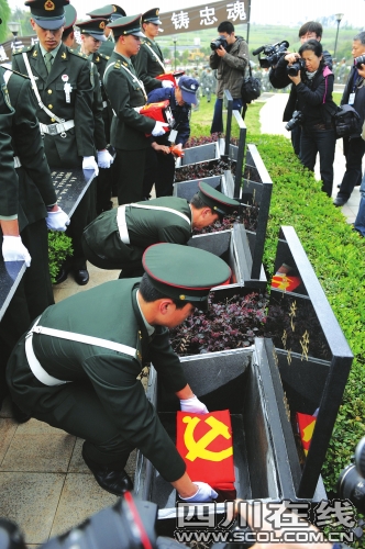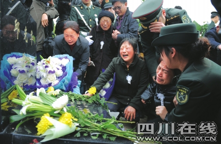 在清明节前夕,刚刚落成的成都市烈士陵园里前来祭奠的人们不绝于途。昨日下午4点,“邱光华英雄机组”烈士邱光华、李月、王怀远、陈林、张鹏的骨灰在15名礼兵的护送下,从磨盘山公墓转移出,安葬于烈士陵园。烈士家属、“抗震救灾英雄陆航团”近500名官兵、都江堰“八一”聚源中学的师生们及近千名群众在邱光华机组烈士墓碑前肃立默哀,久久不肯离去。 含泪迎5位烈士安葬 下午3点半,烈士陵园邱光华机组墓地前战士已肃立,他们胸前的小白花在微风中微微地颤抖。哀乐低回,当主持人下达“安葬”的口令,15名礼兵护送烈士骨灰盒缓步前行至烈士墓碑前,将烈士骨灰盒慢慢放入墓穴,烈士生前战友和陵园管委会工作人员怀着无限的崇敬,缓缓封墓。看着爱人安葬,邱光华的妻子李弟燕再也忍不住了,哭出声来,现场学生、战士及群众们也默默拭去脸上的泪水。 “鸣枪!”27名战士手持钢枪整齐列队,齐齐朝天鸣放,带着永恒的思念共鸣于人们心底,9声枪响久久回荡在陵园上空。苍天肃穆,各烈属、英雄团团长栗国和政委张晓峰分别在礼兵引导下,先后向烈士敬献花篮,随后,在场所有人员肃立默哀。 英雄故事激励后人 所有人都记得,2008年5月31 日,邱光华机组驾驶的直升机在执行抗震救灾任务返航途中,突遇气候变化在映秀附近失事。邱光华、李月、王怀远、陈林、张鹏五名机组人员以身殉职。6月10日,搜救人员经过千难万险终将飞机残骸找到,6月13日,机组五名烈士被安葬在磨盘山公墓。 张晓峰介绍,部队和地方领导对邱光华英雄机组烈士家属十分关心,两年来该团不断收到社会各界人士对烈士家属的慰问。目前5位烈士的家属精神状况良好,邱光华的儿子邱锋在成都军区联勤部任职,王怀远的女儿去年还考进了武汉军事经济学院。在部队中,英雄事迹已广为流传,每次新兵入伍都要接受英雄事迹的鼓舞。 英雄团团长栗国表示:“烈士已离我们远去,但他们忠诚于党的坚定立场,热爱人民的政治本色,报效国家的爱国精神,献身使命的奉献精神值得我们学习一生!” 记者徐洁莹摄影陈羽啸 |
