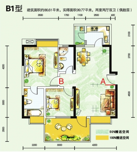 (4)18平米赠送面积,得房率118%。该户型露台、花池均不计算面积,入户花园和阳台以半面积计算,赠送空间超过18平米,且有多处可变空间可自由发挥,得房率较高,性价比也较高。