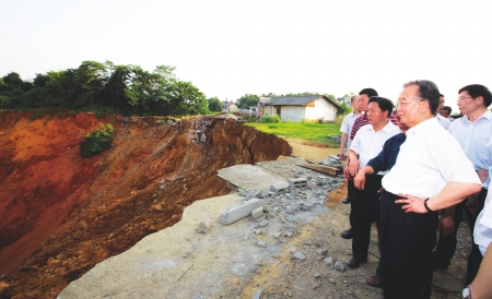 今年入汛以来,湖南省先后发生10次强降雨,湘江干流连续三次出现全线超警戒水位,部分支流发生超历史记录洪水,造成严重的洪涝灾害。7月1日下午,中共中央政治局常委、国务院总理温家宝来到湖南考察防汛抗洪工作。 村民向总理反映问题 他一下飞机,就乘车来到宁乡县大成桥镇察看被洪水冲毁的峨山坝。温家宝在返回宁乡县城途中,人群中一个面色黝黑、四十来岁的中年汉子,走到总理近前:“温总理,我向您反映一个问题。”这位中年人叫陈凯旋。他用手比划着说:“前几天下大雨,清泉村附近塌陷出一个大坑。这几天,大家都提心吊胆。” “伤了人没有?”温家宝焦急地问。“没有。不过,我们还是想请您去看看。”陈凯旋说。 总理拉村民察看“天坑” 温家宝还是拉着陈凯旋的手说:“来,上我的车,你这就带我去看看。” 在陈凯旋带领下,温家宝来到大成桥镇福泉小学教学楼前,一个最长直径约70米,深有30多米、呈椭圆形漏斗状的大陷坑赫然在眼前。大坑边缘,一些民房由于塌陷只剩下一半颓立。大坑周围用粗粗的竹竿围起。温 家宝走到大坑边认真察看,还向村民们了解塌陷情况。村民们告诉总理,这里本来就是沉陷区。今年以来连降暴雨,土质软化,5月8日以后沉陷区多次塌陷,形成了这个大陷坑。 温家宝沉思片刻说:“对于地质灾害,我多少也算一个专家。湖南省各级领导都在这里,我们定下几件事。”要组成专家组,圈定塌陷区范围;迅速转移塌陷区内群众,决不能发生人员伤亡;要妥善安排群众生产生活。这几件事情必须马上做。如果因塌陷造成人员伤亡,一定要追究领导责任。 亲手收下农妇小纸条 就要离开时,温家宝看到一位妇女在不远处啜泣,随即让工作人员把 她叫到自己跟前。 这位妇女递给总理一张纸条。温家宝接过来认真看着。她叫朱君,是塌陷重灾户。她家去年刚花十多万元装修房屋,如今因塌陷不但房子没了,连粮食、牲口都陷在坑里。她希望政府能重视补偿问题。 温家宝拿着纸条念道:我每天日思夜想的是,如果中央领导亲自来看看,那该多好啊!总理念完后对她说:“你看,我不是来了吗?”一句话说得朱君破涕为笑。 “你的意思我懂。刚才我讲的几件事情还应该再补充一条,群众房屋因塌陷倒塌的要合理补偿,一定不让受灾群众经济上再遭受更大损失。”温家宝说。 据新华社 □灾情播报 广西天峨现较大山体滑坡险情 记者2日从广西河池市天峨县委宣传部了解到,当地向阳镇燕来村发生初步山体滑坡,直接影响2000多名群众的生命财产安全。目前,当地已在滑坡危险区域外围设立了安全警示牌,禁止群 众在危险区内通行。 山东13县市遭暴雨袭击受灾 受低涡切变线影响,6月30日夜间开始至7月1日下午,山东省出现大范围强降雨天气过程,郓城等13个县(市、区)受灾。7月1日,邹城市北宿镇前瓦屋村遭受龙卷风袭击,此次龙卷风灾害共造成300人受灾。 据新华社 |
