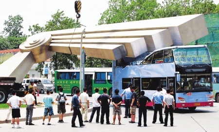 2日,武汉市青山区一标志性不锈钢雕塑拆除时,砸毁一辆行驶中的公交车(左图),致8人受伤,其中一人伤势严重,均已送往医院观察治疗。