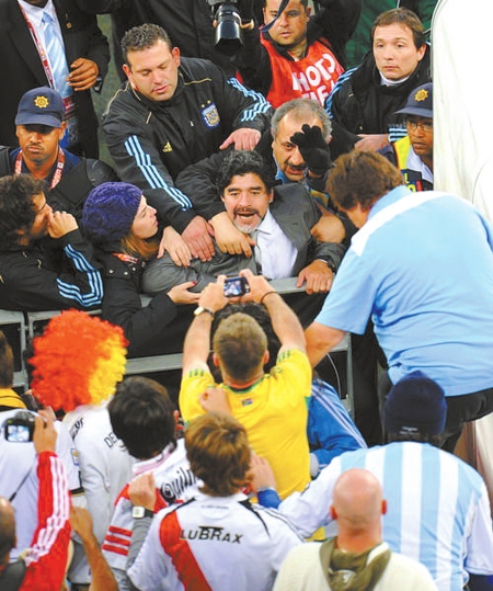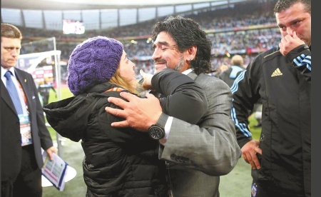 女儿赛后安慰潸然泪下的马拉多纳 1994年,马拉多纳在妻子怀抱中嚎啕大哭。2002年,巴蒂斯图塔壮志难酬流下英雄泪,无不让人心碎。现在,当天不怕地不怕的马拉多纳依偎在女儿达尔玛怀中时,他的泪水充满哀伤。据说,当他回到更衣室时,这位桀骜不驯的球王,与队员哭成一团。 输球后,马拉多纳在新闻发布会上一句“我可能明天离开”引起诸多猜疑,但他后面专门解释称,“我还没考虑离开,我得与我的队员和家人商量(之后才能作出决定)”。 一抱 老马强忍悲伤 昨日赛后,老马不停地安慰每一个球员,特意安慰了痛哭的梅西。他一把将梅西紧紧抱在怀中,两人彼此传递着难言的哀伤。 走向更衣室时,马拉多纳的女儿达尔玛再次迎上前来,与父亲抱在一起。据《图片报》记者后来打听,女儿曾告诉父亲:“我们还可以再来,下次世界杯,阿根廷一定不会这样……现在需要的,是走出阴影。”然而,女儿的安慰似乎没有起到任何作用,甚至更加加重了马拉多纳的伤心。那一瞬间,马拉多纳哭了!这位世界足球桀骜不驯的球王,此时却潸然泪下。全世界不难理解他此时的悲伤。 一哭 勒夫感同身受 看到父亲流泪,女儿也哭了。两人依偎在一起。女儿此时不再说话,用手轻轻抹去父亲脸颊上的热泪。马拉多纳痛哭流涕时,这一幕恰巧被正好路过的勒夫看到……这位胜利者也深有感触,低头不语。 走入更衣室,阿根廷队员正在哭泣,全队悲伤的气氛,又一次感染了球王,马拉多纳自己再也忍不住了,他与队员抱在一起,大家嚎啕大哭。阿根廷足协主席格隆多纳,以及国家队技术顾问比拉尔多,走进更衣室,试图劝慰马拉多纳和阿根廷球员,但收效甚微。 一怒 差点冲上看台 赛后,德国球迷肆无忌惮地庆祝,深深伤害了马拉多纳。马拉多纳来到教练席的后面,开始辱骂那些出言不逊的德国球迷,他甚至还想冲上看台揍他们。不过,老马的女儿达尔玛怕事情闹大,拦住了自己的父亲,而教练组的成员也都过来,避免让事态扩大。 看台上,德国球迷和阿根廷球迷开始推搡,其中目睹自己支持的球队输球的阿根廷球迷火气更大,在听到德国球迷挑衅式的:“阿根廷只有梅西”的讽刺性口号后,阿根廷球迷开始动手了。 □飞刀,又见飞刀 马拉多纳:我没说过要走 0:4惨败给德国队后,马拉多纳在新闻发布会上一句“我可能明天离开”引起诸多猜疑,但他后面专门解释称,“我还没考虑离开,我得与我的队员和家人商量(之后才能作出决定)”,让诸多记者敏感的神经稍微松弛了一下。 赛后的新闻发布会上,头一天还谈笑风生的马拉多纳皱紧了眉头,他说:“我可能会在明天离开,但是这些孩子们还要继续,还要向世人展现什么 是真正的阿根廷足球。” 马拉多纳的一句“离开”石破天惊,此后有记者发问:你的意思是要离开阿根廷队吗?马拉多纳连声否认,“我还没考虑离开的问题,我得和我的球员们、我的家人商量(后才能作出决定)”。 |
