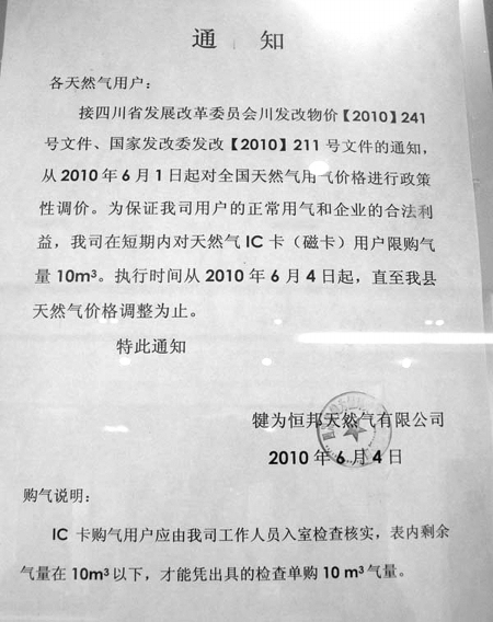 经乐山犍为县相关部门协调,限购数量今起放宽到30立方米 在乐山市犍为县,当地恒邦天然气公司从6月4日起,将居民一次性购买天然气数量限制在10立方米。为了买气,许多家庭隔几天便要跑一趟营业大厅。 1个多月后,恒邦天然气公司从今日起,将普通家庭限购数量放宽到30立方米,特殊家庭则参照去年同期使用量执行。 用户喊累跑两趟才买到10方气 恒邦天然气公司位于犍为县城天生园街,是当地唯一一家天然气供应企业,供应着县城近2.3万户人的天然气。 在该公司营业大厅的窗口,贴着一张《通知》:从6月4日至该县天然气价格调整为止,为保证用户的正常用气和企业的合法利益,公司对天然气IC卡用户实行限购,每户用户每次限购量为10立方米。且在每次购买前,由天然气公司工作人员入室检查,表内剩余气量在10立方米以下,才能凭出具的检查单购气。 “太累人了,要跑两趟才买得到10方气。”前来营业厅购气的肖先生说,第一趟是找工作人员去查表,第二趟才是凭单购气。 肖先生说,因为家里人多、用气量大,6月4日以来,他已经如此往返5次了,“每次还要排队,差不多要耗掉1个小时。” 公司喊冤为打击囤气和降亏损 面对用户的抱怨,恒邦天然气公司副总经理陈明华一脸无奈。 “我们也很冤,限购是没有办法的办法。”陈明华说,近期国家发改委对天然气出厂价格进行调整后,该公司的天然气进价每立方米上涨了0.31元。 而根据相关规定,居民用气价格的上调需要经过听证等程序。截至目前,当地民用天然气价格尚未作出调整。 “也就是说,我们高价买进来,却在低价卖出。”陈明华说,从6月1日以来,公司每售出一方气,便要亏损超过0.2元。 “如果有人趁机抢购囤积,我们的损失将更大。”陈说,县城目前有约4200户天然气IC卡用户,在近期已经排查的1200余户中,最多的用户已经囤积了2700方气。 于是,为减轻公司损失,于6月4日针对IC卡用户出台限购措施,“其实我们也不愿意这样,这样做费了许多人力。” 政府协调限购数量放宽到30方 限购措施出台后,在犍为县城引起了议论。 “县委、政府主要领导都过问了,要求我们调查了解此事,如果有问题要依法查处。”犍为县物价局局长施强说,在查阅了相关政策后,发现并没有任何政策明确规定,在当时的实际情况下,天然气公司不能采取限购措施。 “但我们也明显感觉到,每次限购10方太少了,给市民带来很大不便。”施强说,于是该局和该县发展改革经济局一起,协调天然气公司重新核定限购数量。 昨日下午,经物价和发改部门协调,恒邦天然气公司同意从本月15日上调限购数量。 “普通家庭每次限购30立方米,家庭成员多、用气量大等特殊家庭,参照去年同期1个月的用气量进行限购。”施强说,县城天然气用户中,户月均用气量为21.3方,30方足够大多数家庭使用一个月。 同时,该局也在积极准备,完成听证等程序,上调民用天然气价格,“预计8月下旬前上调,到时就不用再限购了。” 文/图记者丁伟 |