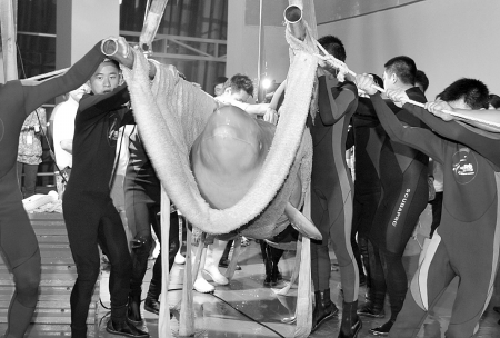 吊车缓缓地把运输担架吊起来时,白鲸在担架中扭动了几下,吓得旁边的10多名工作人员连忙拽紧绳索。一旁的兽医赶紧上前,在它的背上打了一针。