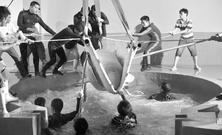 也许是看见人多,小白鲸显得有点不安,在担架中摇摆幅度越来越大,“快,吊车前移,赶紧放进水池里。”