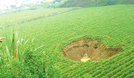 8日以来,地处三峡坝区的宜昌市连降暴雨,该市夷陵区乐天溪镇瓦窑坪村二组的芦笋基地出现了一处地陷