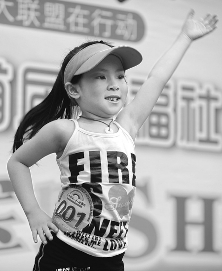 “我给大家带来的节目是健美操‘快乐向前冲’”,陈睿随着音乐节拍动了起来,小小的人儿活力四射,笑容一直挂在脸上,犹如NBA球边缩小版的“拉拉队”女郎。陈妈妈说,健美操的全部动作都是母女俩在家钻研出来的。不过,陈睿小小年纪已经学了近3年的舞蹈,基本功扎实。