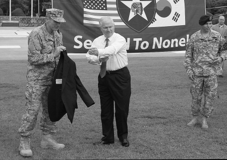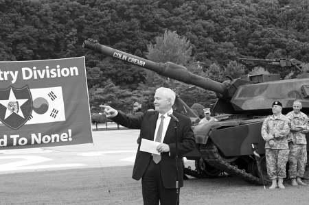 20日早上在位于东豆川的驻韩美军基地凯西军营视察时,盖茨透露21日将与当天清晨抵达韩国的美国国务卿希拉里一道前往首尔的龙山战争纪念馆参观,两人届时将向在朝鲜战争中阵亡的联合国军士兵以及在天安舰事件中丧生的46名韩国官兵敬献花圈。