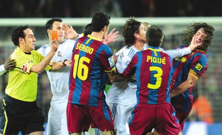 什么是德比战?就是不管比赛结果是什么,双方一定会踢得脸红脖子粗,红黄牌满天飞,甚至是出手打人,最后还谁都不服谁。北京时间昨天凌晨皇马与巴萨之间进行的第239次大战,就把西班牙国家德比的精髓演绎得淋漓尽致。除了5个精彩的进球,比赛中的小动作和冲突不断,让人不得不感叹:国家德比就应该这么火爆!