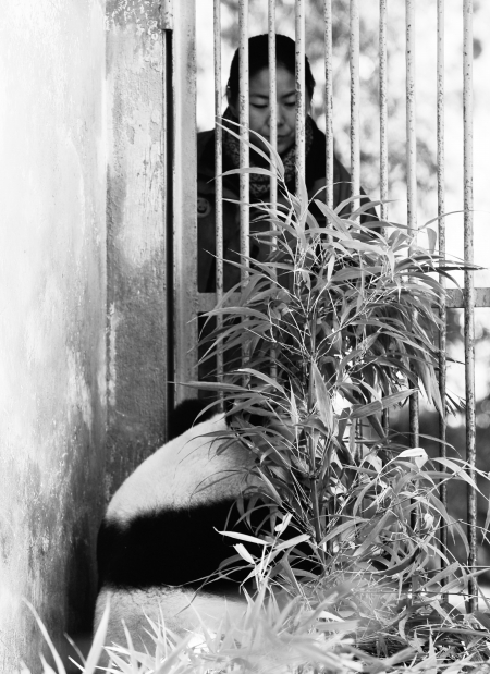 打扫完圈舍,研究人员开始喂养仍处在圈养状态中的大熊猫“紫竹”、“英萍”和“张卡”。当然,还要有专人对“草草”母子俩进行24小时监控。