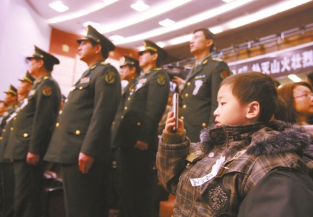 小佳峻和他妈妈坐在第一排,前面就是他爸爸的遗像。和小焦傲一样,5岁的他并不太清楚,爸爸已经永远地离开了他和妈妈。他拿着妈妈的手机,一直低头玩着。