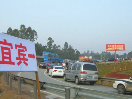 但车辆已经迫不及待。通往宜宾的匝道上,小车、货车、大巴已经排起了长龙,有乐山、宜宾牌照,也有成都、重庆牌照。排在最前面的,是一辆宜宾牌照的奔腾小车。“3点钟我就来等起了。”车主郑修平说,他从成都回宜宾,从电台里听到通车消息后,决定来走一遭。