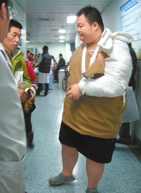 体重超过170公斤的相扑手龚伟左手肱骨骨折,因身躯庞大检查受阻