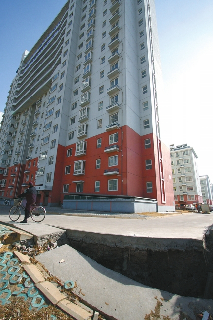 在江苏连云港杰瑞花园小区5号楼(共17层)北侧,连云港东盛房地产开发公司拟建一幢32层楼的写字楼,目前正在做基坑,基坑的土全堆在5号楼的西南侧,导致夹在土堆和基坑间、位于5号楼西侧的一排民工房倒塌,5号楼也随之出现沉降(左图),部分住户担心会步上海“楼倒倒”的后尘,现已搬出该楼。 在5号楼西北角处一处车棚及两段围墙断裂塌陷,坑深近两米。透过围墙就能看到“肇事基坑”,约有几千平方米大小,深约6米。坑内打下的直径60厘米的水泥桩,约七八根都向北斜歪着。靠近5号楼围墙的一段基坑护坡,也出现起鼓、断裂现象。 据《扬子晚报》 |
