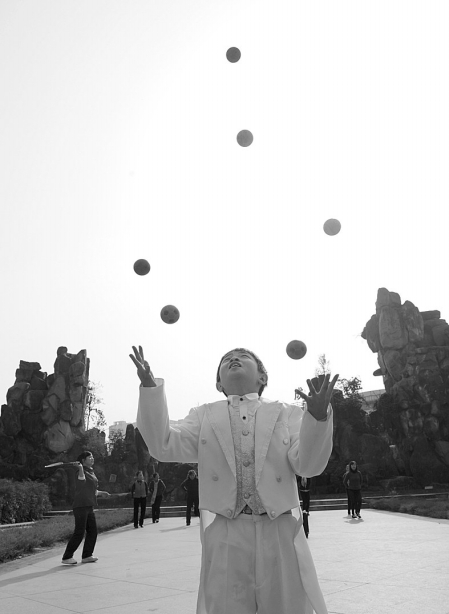 “表演个‘灵蛇飞舞’。”昨日中午,成都三洞古桥公园内,沈笑世坐在花坛上说。站在沈笑世面前的小男孩,随即拿出4个小球,往空中抛去。4个球形成一条弧线,在小男孩双手间来回穿梭。男孩名叫沈洋屹,是沈笑世的儿子。3天前,他收到央视邀请,将亮相2011年的央视网络春晚,表演抛球绝技。