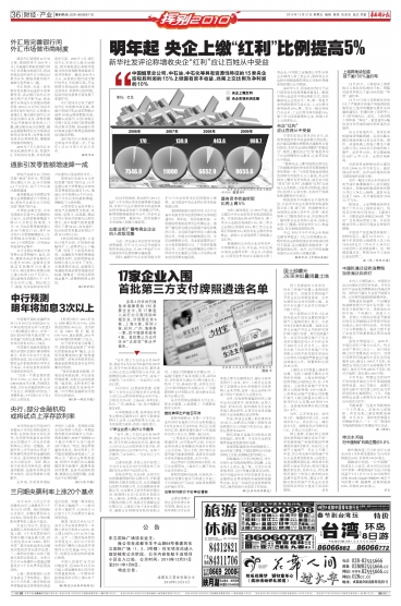 明年起 央企上缴“红利”比例提高5%