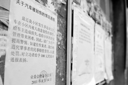4月14日,成都大学路12号小区门口贴出一张“悬赏”告示:小区业委会悬赏100元,寻找小区里划车的黑手。