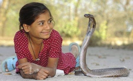 这名胆子超级大的女童跟家人住在印度北方邦卡登布尔的农村。她的祖父和父亲都是当地有名的捕蛇人。