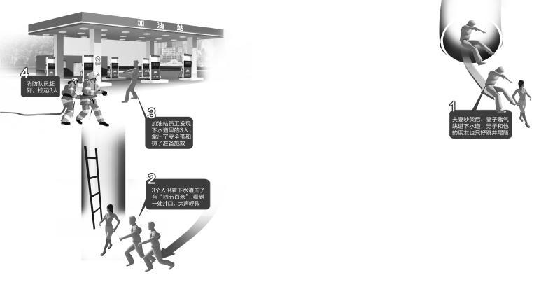 昨天中午,成都市蜀西路171号加油站门口突然传出了呼救声。加油站工作人员循声找人,发现门口正在改建的绿化带内,一个窨井下居然有3个人在下水道里。人怎么跑到下水道里去的?原来是夫妻闹矛盾,老婆跳下井,丈夫和朋友随之下井,结果走了几百米才看到一个井口,急忙呼救。