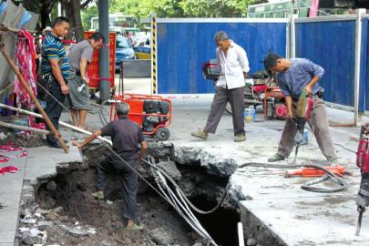 昨日,记者在文星街看到,一个大坑周围被拉上了警戒线,并摆上了“前方施工”的警示牌,工人正忙着在测量大坑的面积和深度,现场几台破土机也在作业。由于施工占了人行道和道路的大部分,文星街交通比较拥堵。