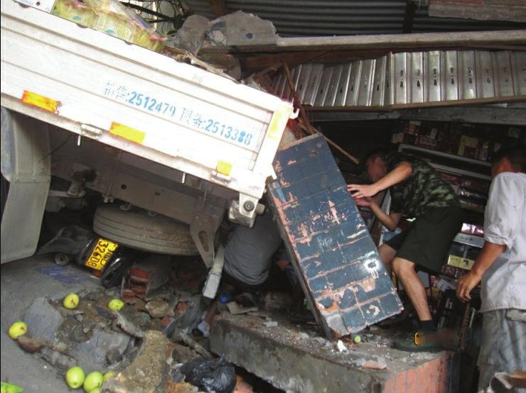 昨天下午1点过,攀枝花市西海岸菜市场旁,一辆满载水果的东风小型货车刹车失灵,自动下滑,货厢冲进路边的一个小卖部,将墙体撞垮,一名5岁小女孩不幸被撞倒,头部严重受伤。