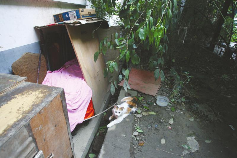为了收留流浪猫,宋女士没少给邻居们“打麻烦”。她在院子的绿化带里搭了6个简易的棚子,给猫居住;大院的自行车棚里也搭着猫窝;院子的凉棚中央放着一张写字台。“下面堆着她喂猫的碗。”住在大院一单元2楼的陈大爷说,“这个花棚本来是给大家休息的。”