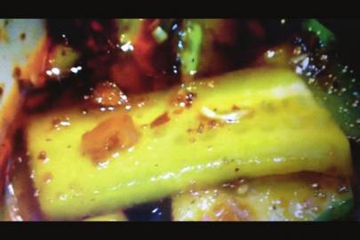记者在视频中看到,在一个印有“食客天下”字样的碗里,一条长约1厘米的蛆状白色小虫附在一片黄瓜上,几秒过后,白色小虫在黄瓜片上来回蠕动。