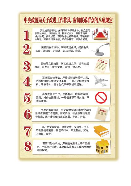 会议一致同意关于改进工作作风、密切联系群众的八项规定。规定要求,中央政治局全体同志要改进调查研究,到基层调研要深入了解真实情况,总结经验、研究问题、解决困难、指导工作,向群众学习、向实践学习,多同群众座谈,多同干部谈心,多商量讨论,多解剖典型,多到困难和矛盾集中、群众意见多的地方去,切忌走过场、搞形式主义;要轻车简从、减少陪同、简化接待,不张贴悬挂标语横幅,不安排群众迎送,不铺设迎宾地毯,不摆放花草,不安排宴请。要精简会议活动,切实改进会风,严格控制以中央名义召开的各类全国性会议和举行的重大活动,不开泛泛部署工作和提要求的会,未经中央批准一律不出席各类剪彩、奠基活动和庆祝会、纪念会、表彰会、博览会、研讨会及各类论坛;提高会议实效,开短会、讲短话,力戒空话、套话。要精简文件简报,切实改进文风,没有实质内容、可发可不发的文件、简报一律不发。要规范出访活动,从外交工作大局需要出发合理安排出访活动,严格控制出访随行人员,严格按照规定乘坐交通工具,一般不安排中资机构、华侨华人、留学生代表等到机场迎送。要改进警卫工作,坚持有利于联系群众的原则,减少交通管制,一般情况下不得封路、不清场闭馆。要改进新闻报道,中央政治局同志出席会议和活动应根据工作需要、新闻价值、社会效果决定是否报道,进一步压缩报道的数量、字数、时长。要严格文稿发表,除中央统一安排外,个人不公开出版著作、讲话单行本,不发贺信、贺电,不题词、题字。要厉行勤俭节约,严格遵守廉洁从政有关规定,严格执行住房、车辆配备等有关工作和生活待遇的规定。