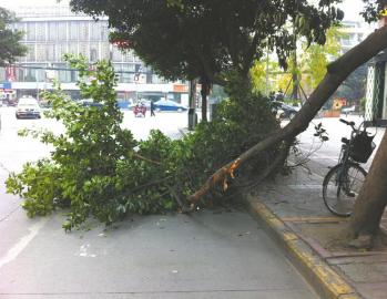 昨日中午1点左右,市民张女士坐在紫藤路8号的超市外休息,此时一辆货车沿紫藤路往大石西路方向行驶,在快到路口时车右侧突然撞到了一棵行道树。“撞击的声音很响,最大的一根树枝被撞断,只有一点点连在树上,摇摇欲坠。”张女士说,肇事的货车很快开走,2分钟后树枝落在地上,“差点砸到一辆经过的轿车。”