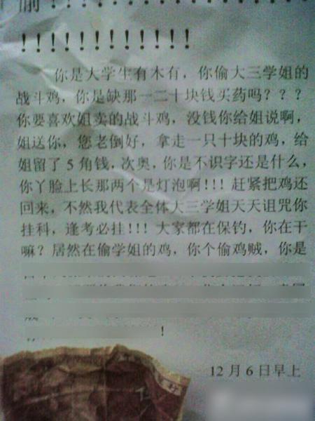 “你是大学生有木有,你偷大三学姐的战斗鸡,你是缺那一二十块钱吗?你要是喜欢姐卖的战斗鸡,没钱你给姐说啊,姐送你,您老倒好,拿走一只10块的鸡,给姐留了5角钱……”显然,丢失“战斗鸡”的这位“姐”很气愤。