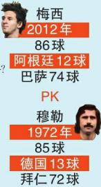 盖德·穆勒1972年在60场比赛中打进了85球,但他的纪录现在被梅西打破,梅西2012年迄今在66场比赛中打进了86球。数据对比,谁更不可思议呢?进球场次