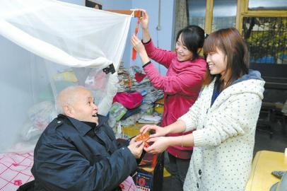 与往常不同,昨日上午,成都锦江区交子社区孤寡老人肖德铨大爷家里好热闹,本报征集的两名春节期间照顾孤寡老人的大学生志愿者杨丹和姜莱来到肖大爷家里,为老人装饰屋子。