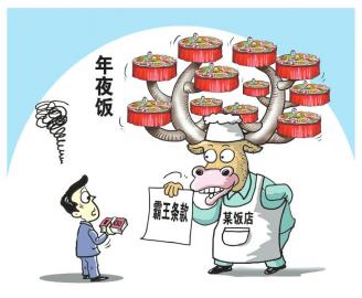 物价“涨”声四起、年夜饭设置最低消费、打折优惠政策禁止使用、“霸王条款”“消费陷阱”死灰复燃…… 春节来临消费旺盛,商家为了获取更多的利益制定了各种“规矩”,想方设法让消费者多掏钱,让不少市民大呼“伤不起”,年夜饭都成了“年夜烦”。 (2月6日《春城晚报》)