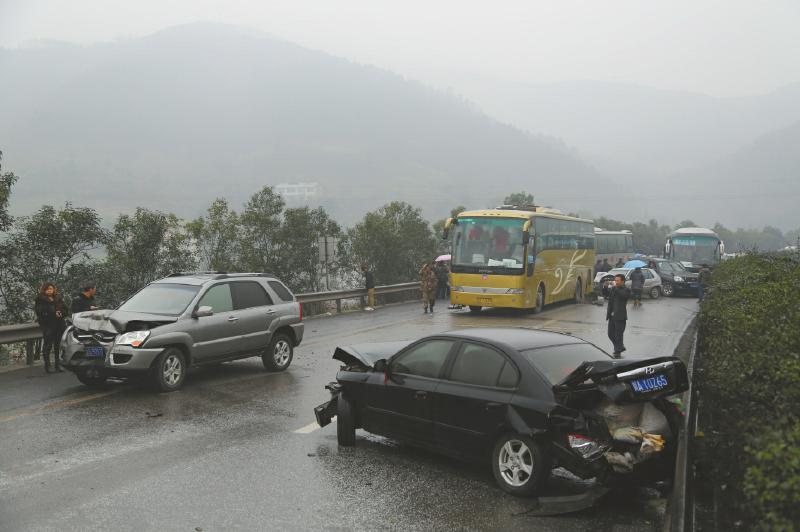 昨日上午,春雨淅沥,沪蓉高速路上赶着回家过年的车辆,比平时增加不少。往成都方向走出老山梁子隧道,数公里的长下坡结束,很多车子习惯提速前行,孰料还有一个大大的急弯,加之天雨路滑,很多不熟悉路况的司机顿时难以招架。