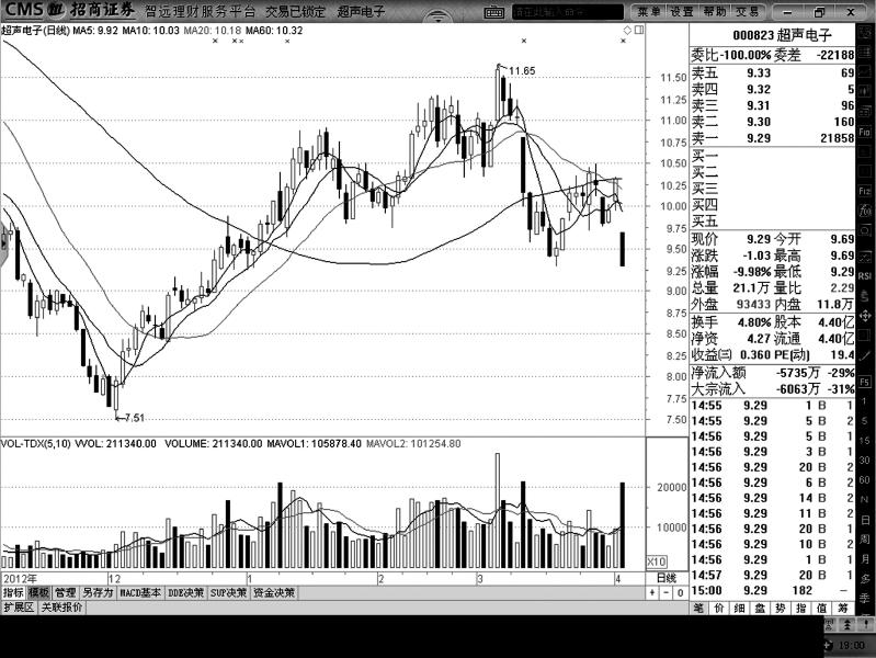 昨日,超声电子大幅跳空低开,股价在震荡中不断走低,最终在午盘前封死跌停直到收盘。超声电子跌停,主要是因为公司昨日发布了业绩快报和一季报预告。去年超声电子的业绩小幅增长,但一季报的业绩就差了很多。超声电子预计今年一季度的净利润为1340.79万元-2681.58万元,比上年同期下降60%-80%。