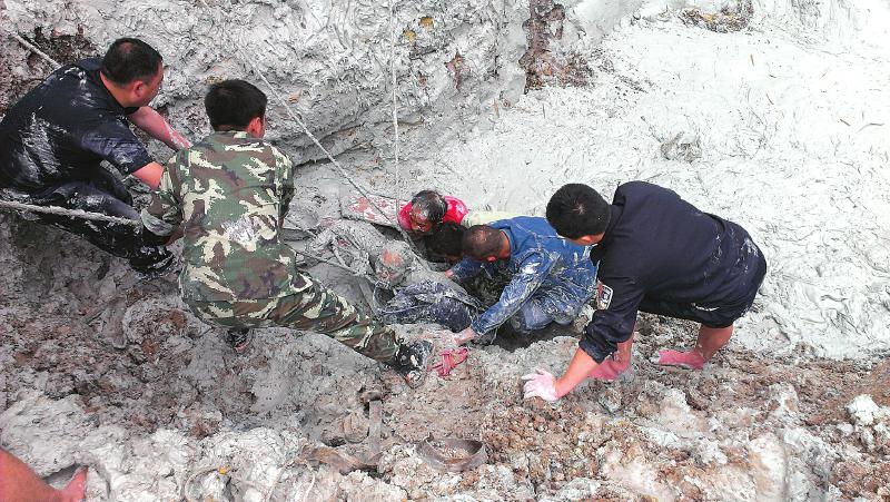 在重力的作用下,老人周围的青石灰泥开始向旁边的泥坑流动,这时老人身体露了出来,逐渐脱险。同时,多名救援人员在老人周围刨挖青石灰泥,用脸盆等工具将其运走。