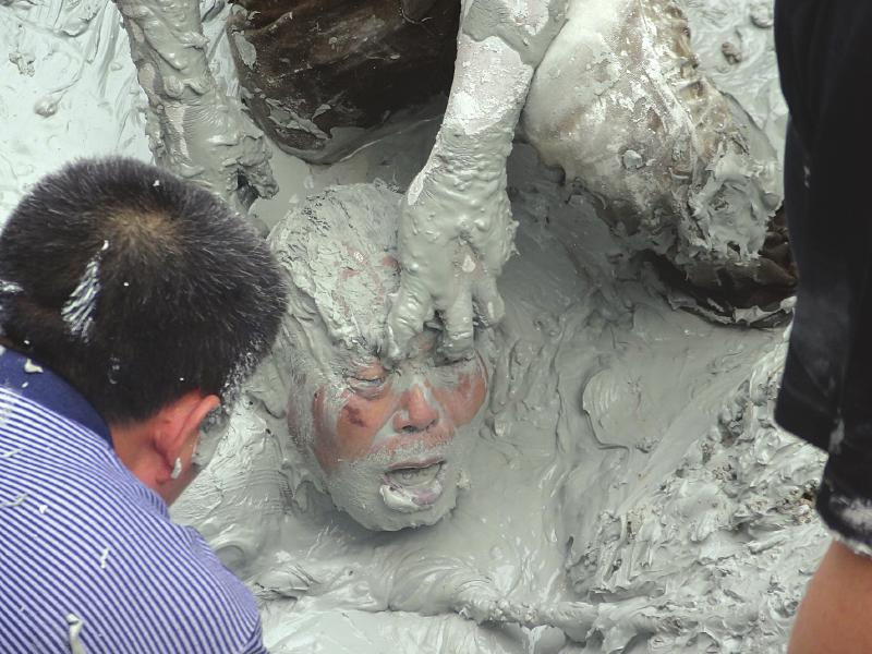 随后,村民又找来几块大木板,插在被困老汉周围,希望通过木板挡住被困老汉外侧的青石泥,然后在木板内侧刨挖,将被困老汉救出。因为泥潭中的青石泥多达数十吨,木板不能阻挡潭中青石泥的流动,插入木板仍无法将被困老汉救出。