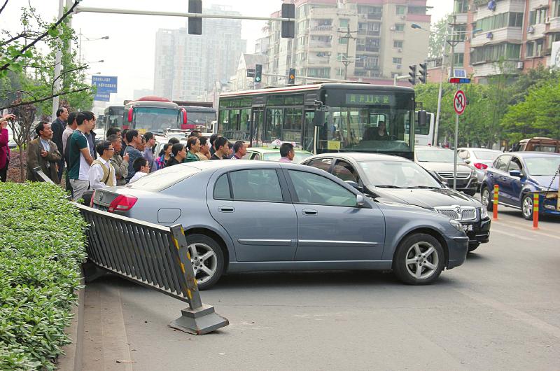 事故 自行倒车 轿车撞倒铁护栏