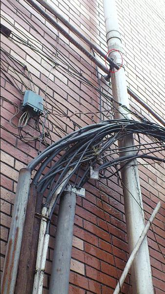 顺着他手指的方向,记者看到,水是从排水管离地面约3米处的一个小口流出的,水量不大,但一直持续滴在排水管下方0.5米处的数根通信电缆上。“这些都是有电的,万一水一直滴下来引发火灾怎么办?”蒋先生担心。