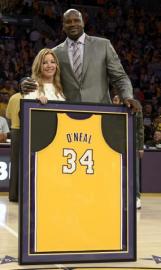 在湖人前老板杰里·巴斯的长女珍妮·巴斯主持下,两名湖人女孩抬着镶有奥尼尔34号球衣的大相框出场。随后,覆盖在34号球衣上的黑幕布被缓缓拉下,奥尼尔的球衣高高悬挂在斯台普斯中心,紧挨着“魔术师”约翰逊的32号球衣。