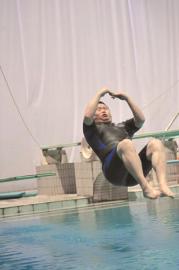 韩庚3米跳板,水压让上颚受伤出血;5米板时被水拍晕。包小柏5米跳台跳水,双目被水拍造成短暂性失明。歌手黄征也出现翻转失误,后背被拍到红透。丫蛋、王丽坤等连游泳都还没学会。