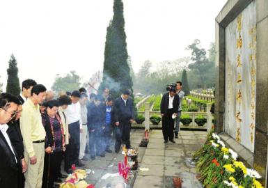 “开国上将成都军区首任司令员缅怀活动开始”,4月2日上午10点,在成都磨盘山公墓,贺炳炎的长女贺北生、次子贺陵生携家人及30多名红军后代在贺炳炎的墓前祭奠哀思,缅怀先烈。