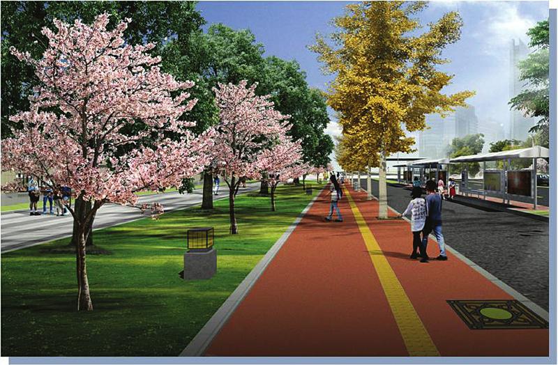 同时,除了车行道的改造之外,按照设计方案,人行道也将改造成“一道红”。“人行道改造将铺筑花岗石路面,在两排行道树的中间,铺一条3米宽的红色沥青混凝土柔性漫步骑游道。”朱宇告诉华西城市读本记者,这是内江借鉴其他城市经验,首次在城区主干道上铺筑彩色沥青混凝土柔性慢步骑游道,连同西林大道、东桐路等路段,将成为未来内江城区100公里彩色沥青混凝土柔性慢步骑游道的示范路段。配套变化