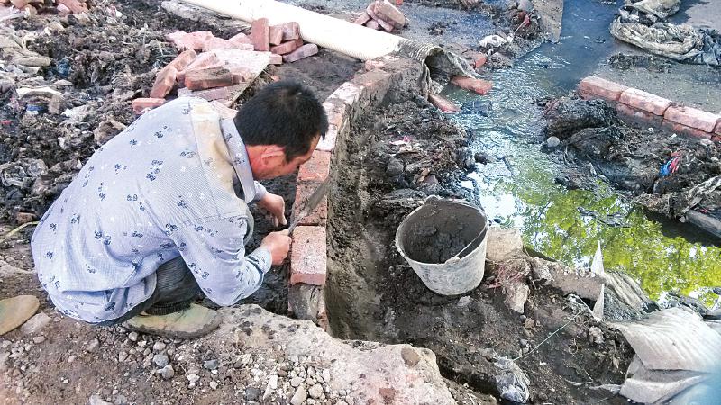 下方工地的工作人员张先生解释道,污水的溢出是由于污水管道破裂,但自己所在工地已进行了排污管道安装处理,而现在流淌的污水来自上方工地。记者进入上方的工地,发现污水出处又脏又臭,有工人正在其四周砌砖。砌墙的地方连接着一条新的塑料管道,延伸到下方的污水井。