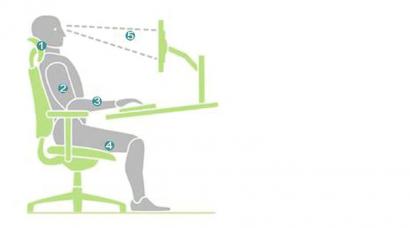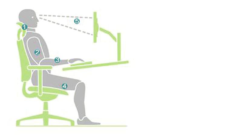 1、身体向后倾,颈部有扶托;2、手臂自然下垂,放置椅子托手;3、手与键盘平行;4、膝盖微高于座椅,使血液顺畅运行;5、屏幕略低于视线。